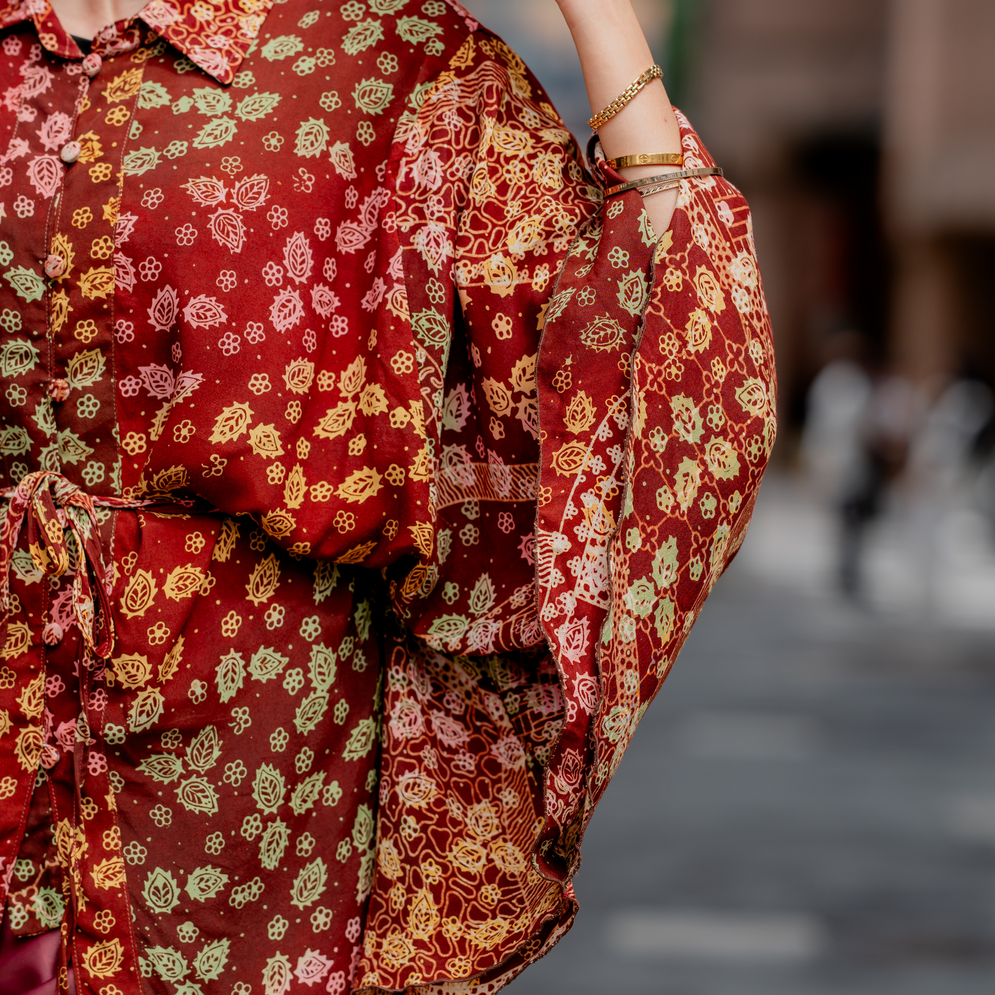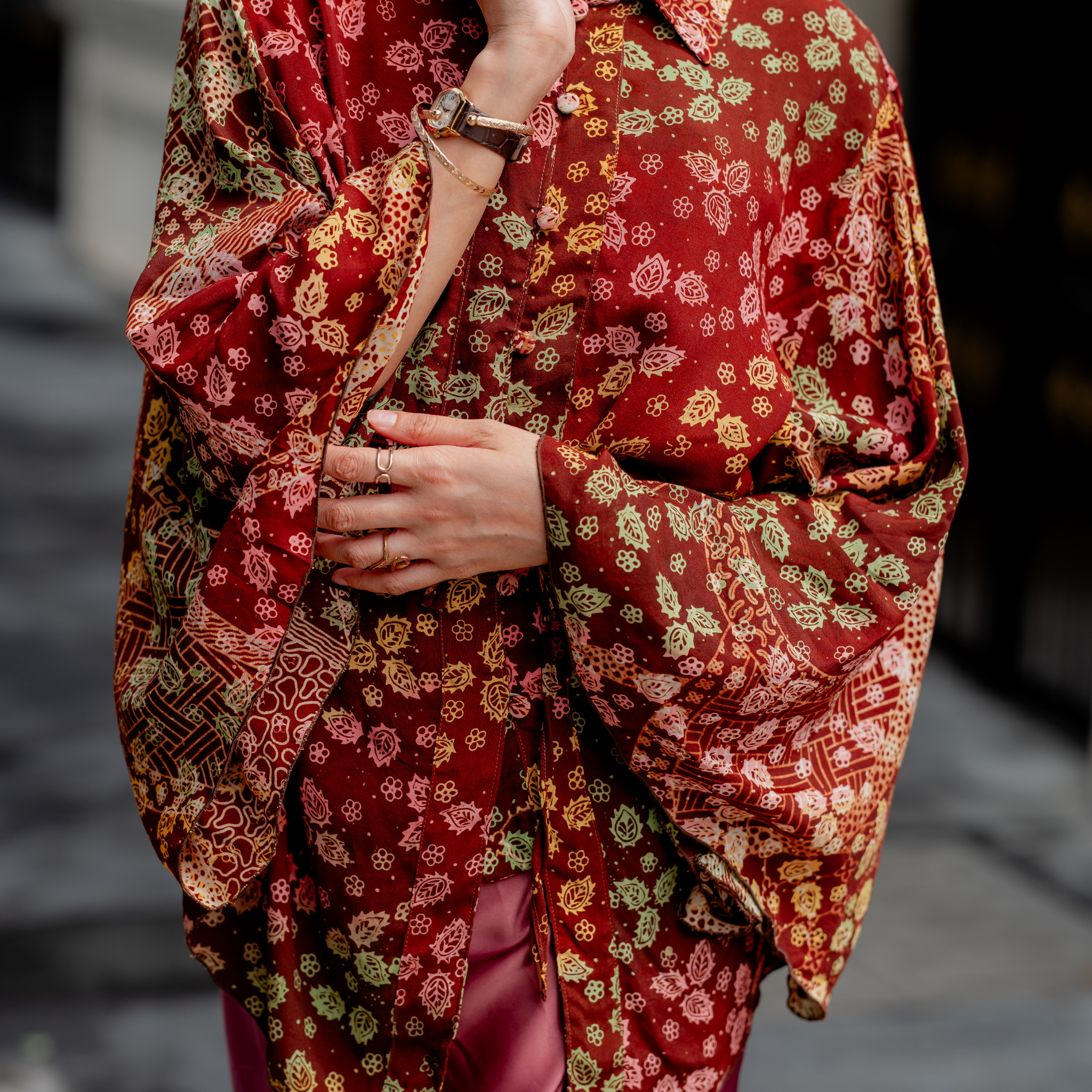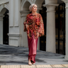 This batik top features intricate floral motifs in rich, warm hues, crafted from lightweight batik fabric, the relaxed silhouette offers comfort while maintaining an elegant drape.