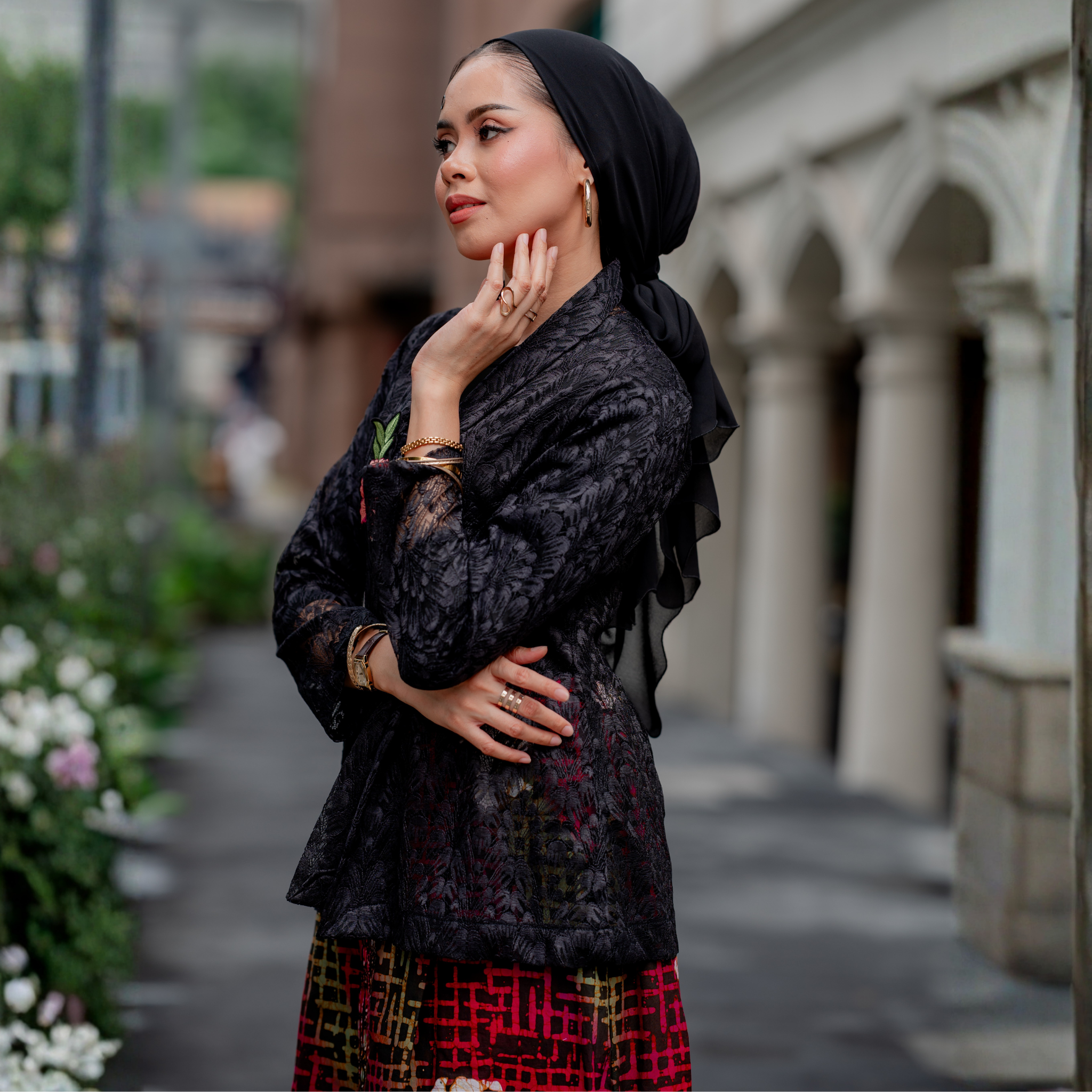 A timeless classic, reimagined. This black lace kebaya is elevated with delicate floral attachment, adding a soft, feminine highlight to a bold silhouette.